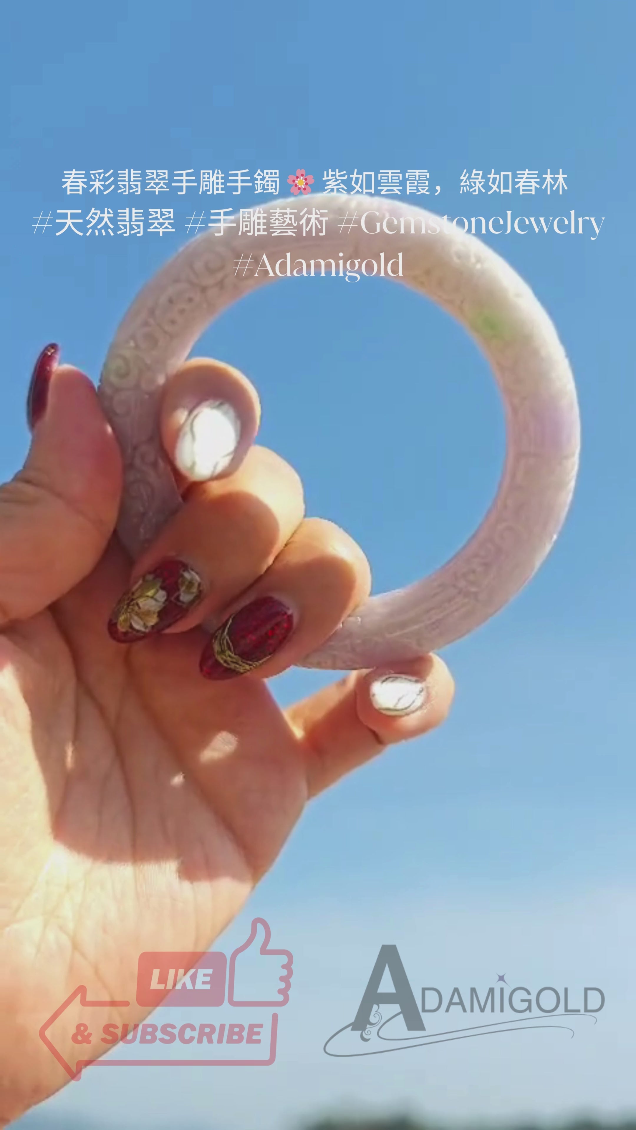 #春彩翡翠 #翡翠手雕手鐲 #天然翡翠 #翡翠手鐲 #翡翠圈口58_4MM #翡翠厚度12_7MM #翡翠證書 #奢華珠寶 #Adamigold #SpringColorJadeite #HandCarvedBangle #NaturalJadeite #58_4MMJadeiteBangle #12_7MMThickness #CertificateIncluded #LuxuryJewellery #GemstoneJewelry #Adamigold