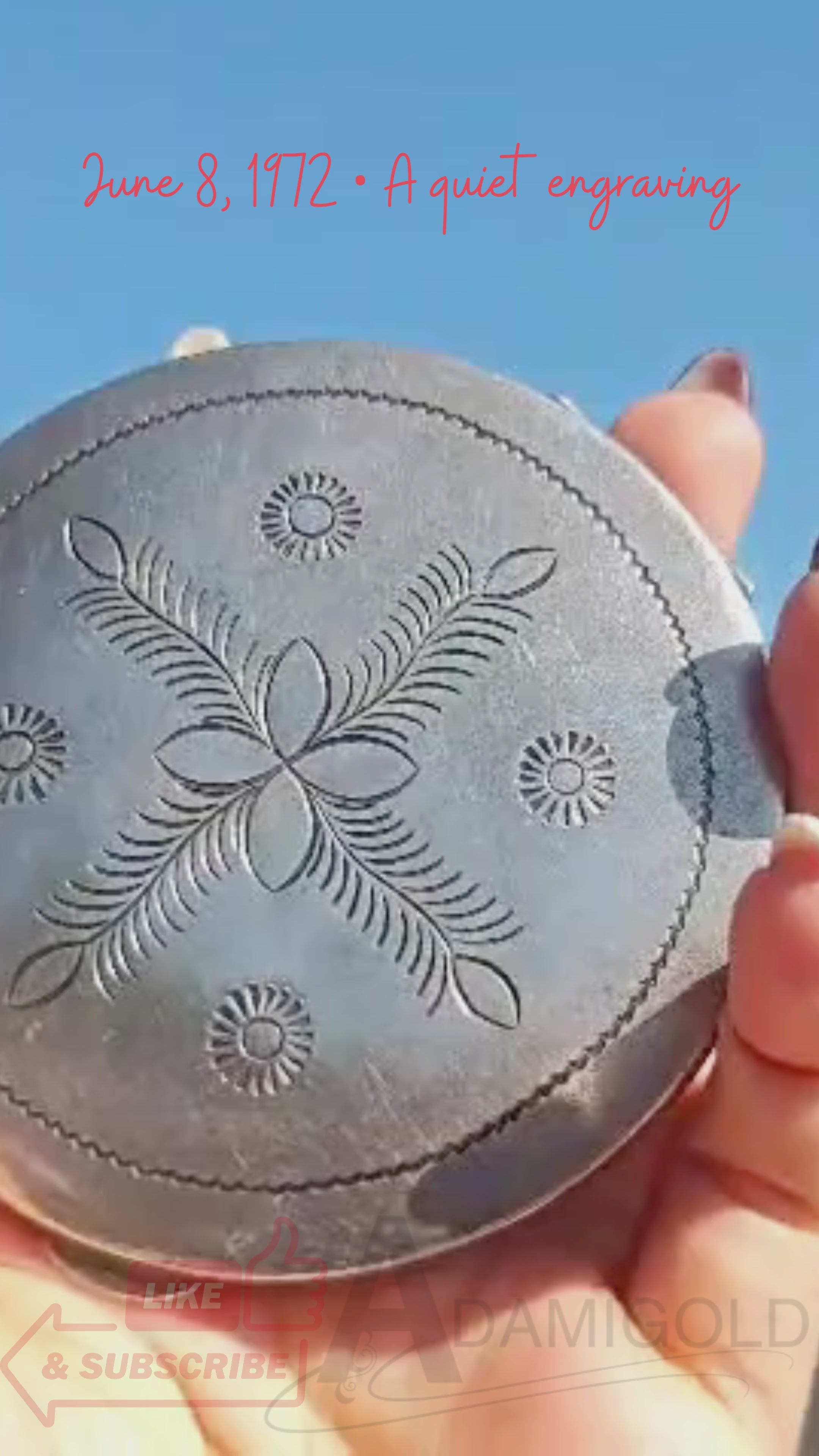 This vintage mirror box carries a quiet engraving dated 8 VI 1972 — June 8, 1972. Worn and scratched, it reflects decades of silent stories. A timeless keepsake for collectors who appreciate elegance and history.